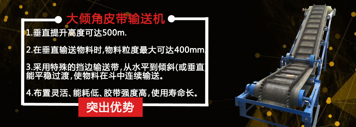 DJ型大倾角皮带输送机与普通式输送机、斗式提升机、刮板输送机比较其综合技术性能都非常优越.输送量大可达6000m3/h垂直提升高度可达500m.在垂直输送物料时物料粒度大可达200mm,从水平到倾斜(或垂直)能平稳过渡,能耗低、结构简单、维护方便、皮带强度高、使用寿命长.