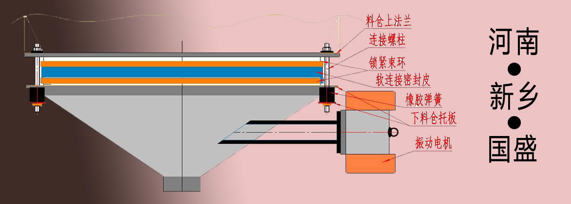 振动给料斗是用螺栓固定在储料仓下部,料斗内装有球面活化器,它将水平方向的激振力分解为沿球面法线方向和切线方向的分力。法线方向沿放射方向传递到物料深处,从而破坏了料仓内的垂直料拱,促使活化器上部的物料从中心向四周快速移动,再沿仓壁下滑,实现物料的整体流动,从出料口均匀排出。